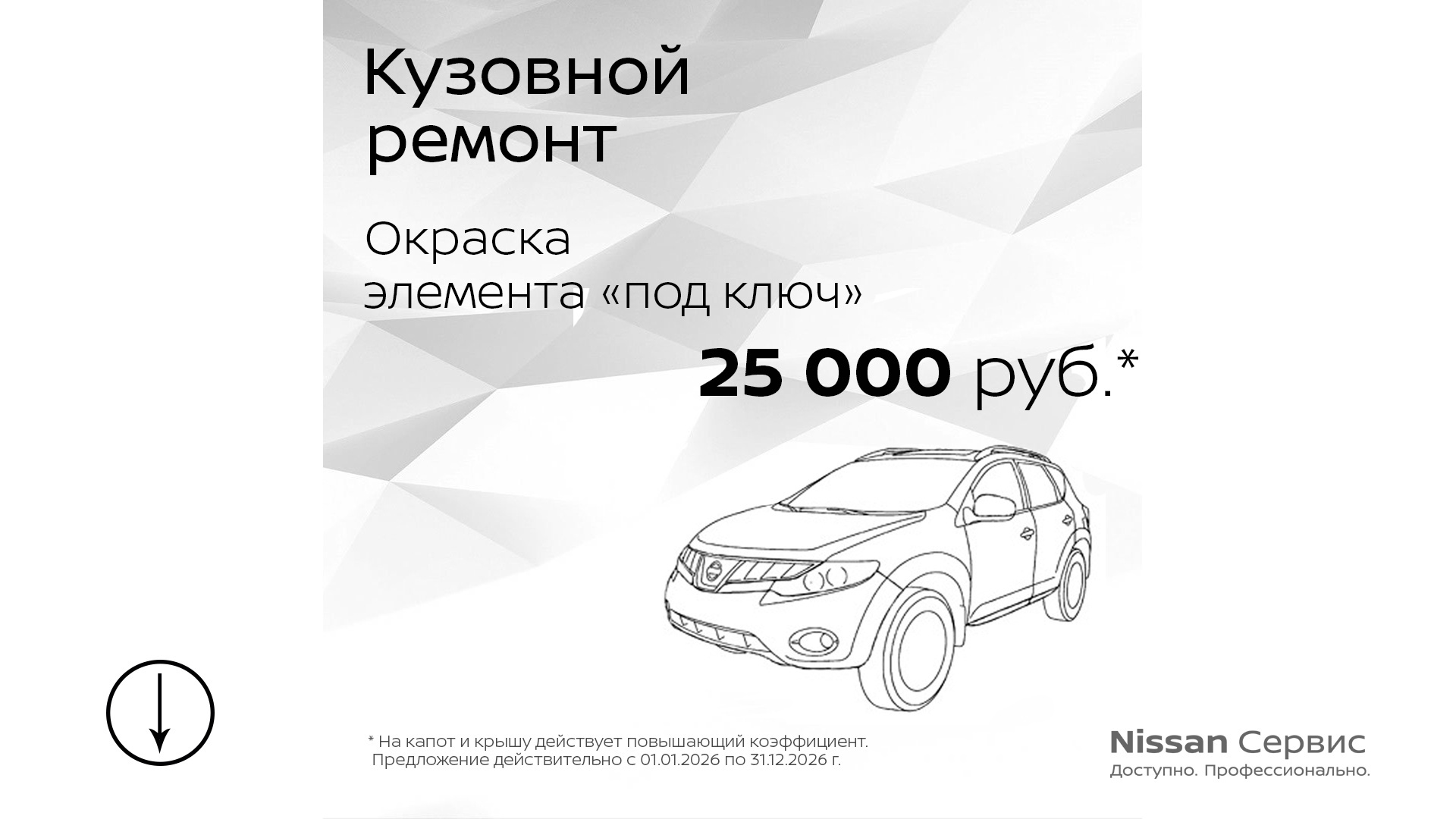 * На автомобили Nissan Qashqai, Nissan Terrano, Nissan X-Trail, Nissan Murano, приобретенные с 01.10.2019, после окончания 3-летней гарантии или 100 000 км пробега предоставляется постгарантийная поддержка сроком на 2 года или 50 000 км пробега на двигатель, КПП, полный привод, согласно правилам и ограничениям. Не является гарантией завода-изготовителя. Подробности на www.nissan.ru